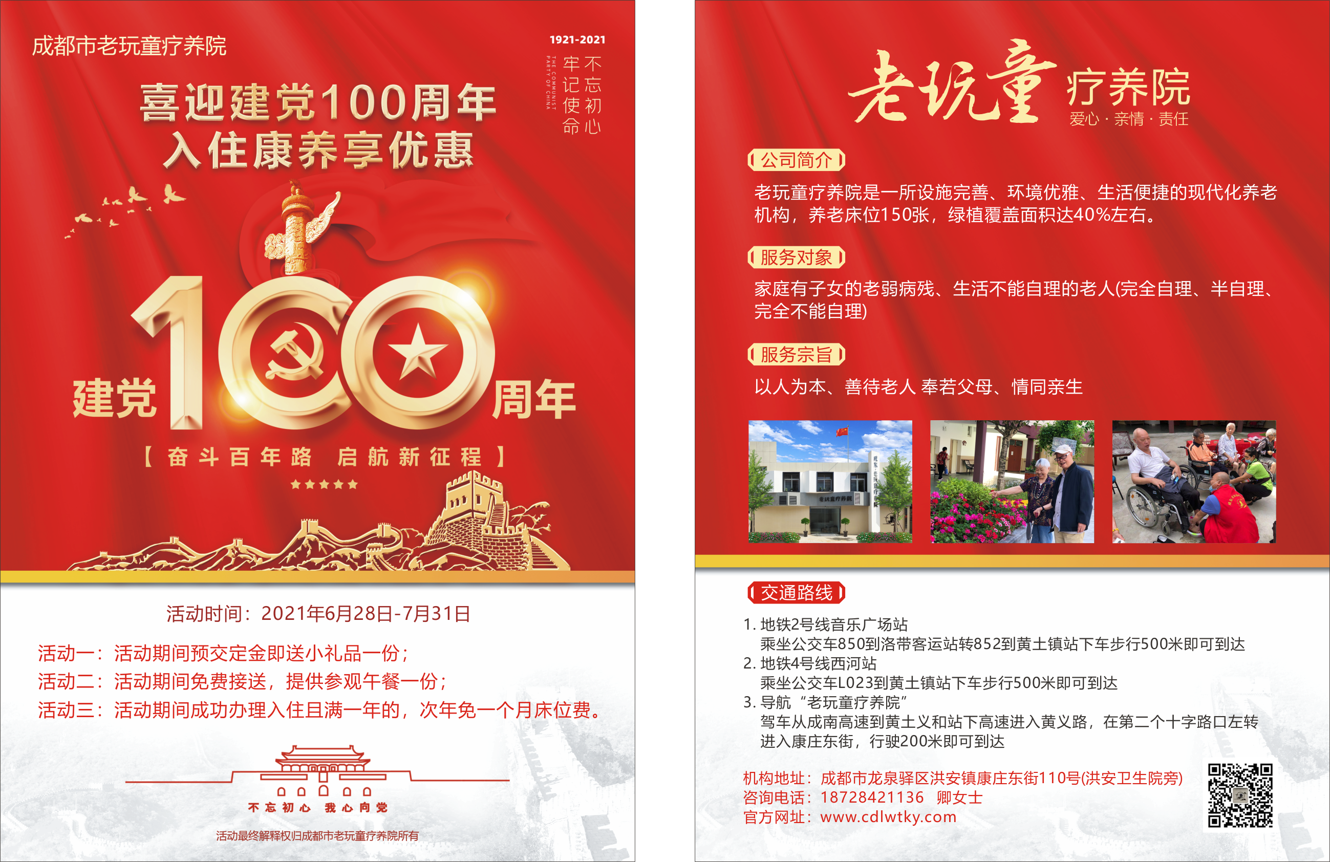 成都市老玩童養(yǎng)老服務(wù)有限公司(以下簡稱:老玩童療養(yǎng)院)是一所設(shè)施完善,環(huán)境優(yōu)雅,生活方便的現(xiàn)代化養(yǎng)老機構(gòu)。目前老玩童療養(yǎng)院開展了醫(yī)養(yǎng)結(jié)合的新型項目,院內(nèi)開放養(yǎng)老床位150多張,住院床位40多張,專業(yè)照顧中風(fēng)/腦梗/帕金森/失能/失智/各種原因?qū)е律畈荒茏岳硪约案啐g老人。我們設(shè)身處地的為老人考慮諸多問題,老人有個頭疼腦熱的不用出門,洪安衛(wèi)生院作為老玩童療養(yǎng)院的配套醫(yī)院,院內(nèi)…